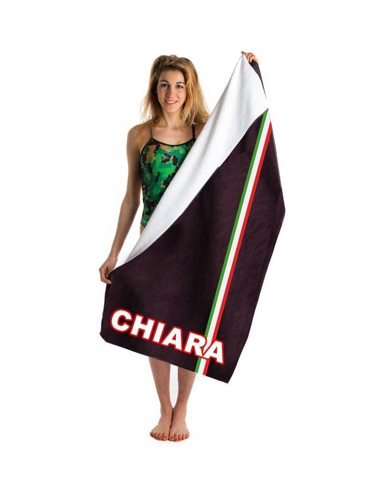 È un fantastico asciugamano per nuotatori, perfetto come telo mare e con il tuo nome sopra! Super! meraviglioso anche per essere utilizzato come striscione alle gare tra un'asciugata e l'altra. L'asciugamano con nome personalizzato è nero ma lo strovi anche in blu royal qui su SwimmerShop.