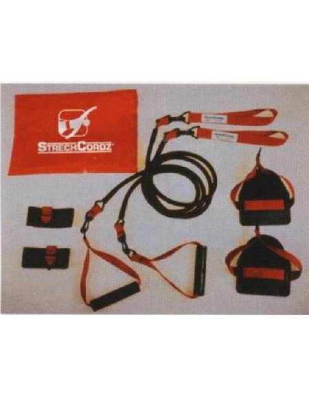 Un kit completo per l'allenamento a secco. Questo kit include maniglie, palette e cavigliere intercambiabili ed un paio di elastici in guaina tubolare di un metro e venti (1,2m) di lunghezza, con anelli di fissaggio. Include una pratica borsina da trasporto. Per montare gli elastici STRECHORDZ: Scegliete un area abbastanza spaziosa che vi permetta di eseguire tutti gli esercizi. Scegliete un punto di ancoraggio solido, come una maniglia, una ringhiera, un palo o una recinzione. Usate l'anello di montaggio come un nodo scorsoio intorno al punto di ancoraggio scelto