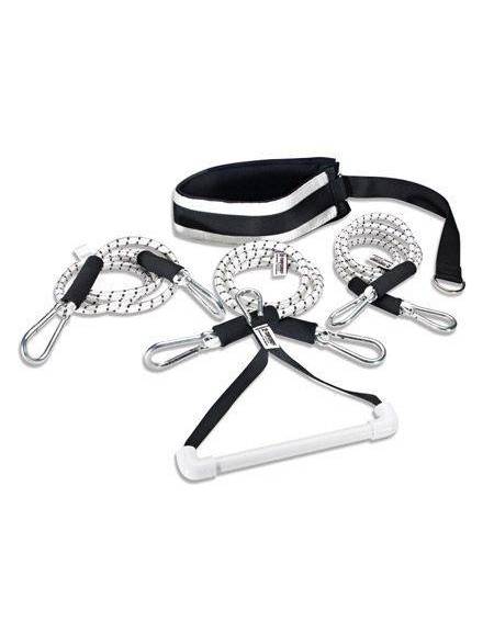 Una pratica cintura regolabile, con neoprene, alta 11.4 cm con anello a "D" di acciaio, si adatta fino ad una circonferenza di 130 cm. In dotazione nel kit tre elastici Bungie di 2,4 metri e con tre diverse resistenze alla trazione. Gli elastici, grazie a resistentissimi rocchettoni di acciaio possono essere collegati sia alla cintura che a un pratico e resistente maniglione. Acquistabili separatamente elastici di diversi livelli di resistenza per adattarsi al lavoro dell'atleta. Utilizzabile in programmi di allenamento di moltissimi sport tra cui calcio, basket, pallavolo, rugby e atletica